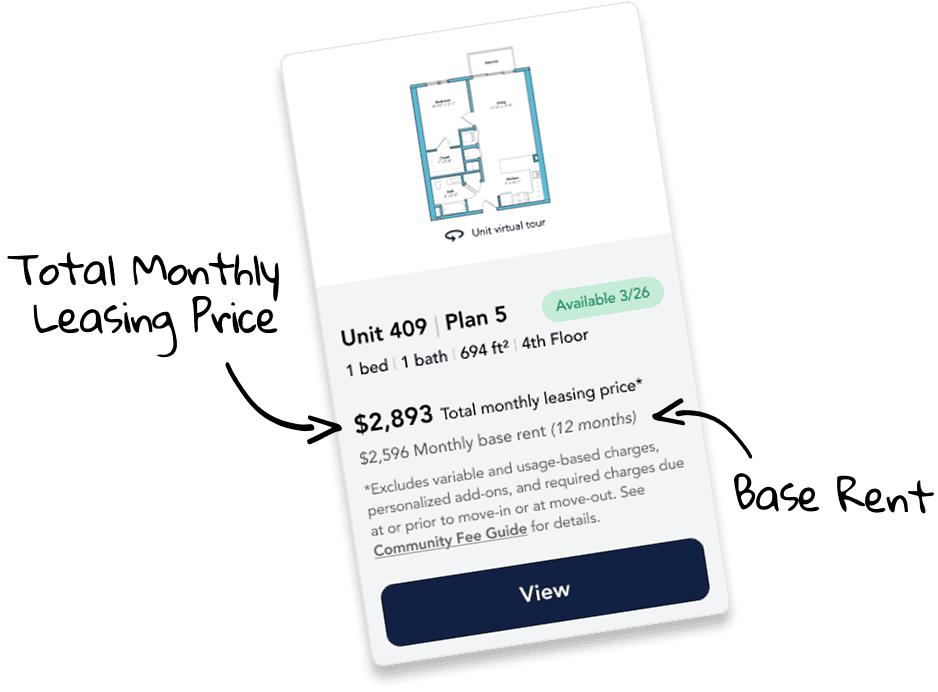 Our goal is to help you plan your budget with ease, enhancing your rental home experience. Prices shown are base rent. To help budget your monthly fixed costs, add your base rent to the Essentials and any Personalized Add-Ons you will be selecting from the list of potential fees which can be found at the bottom of the page.
